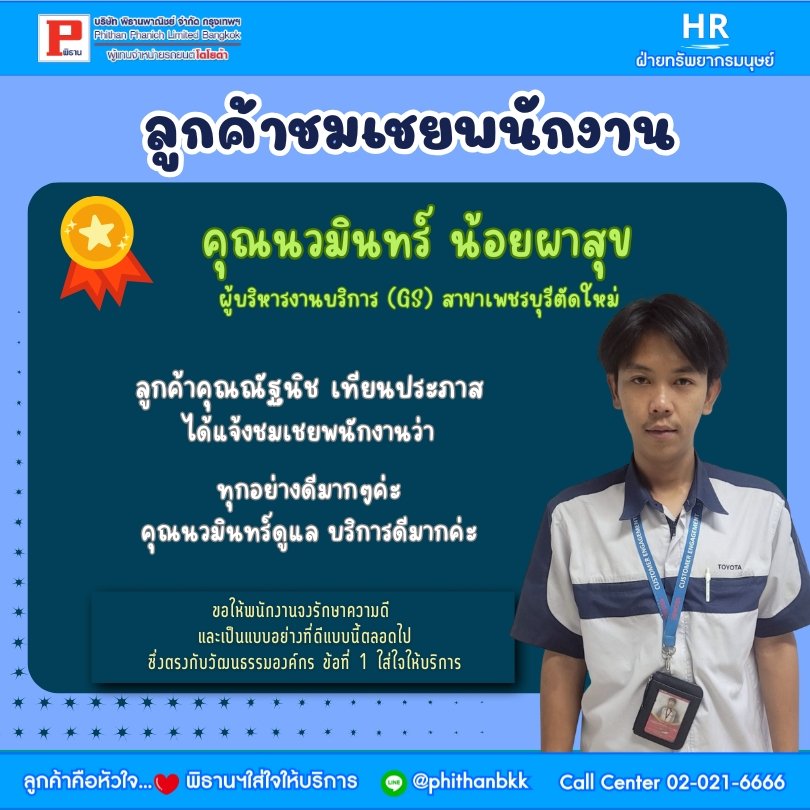 หน้าแรก>> แผนกทรัพยากรมนุษย์>> รางวัลและการชมเชย>> ชมเชยบริการ GS/BP 2568>> คุณนวมินทร์ น้อยผาสุข