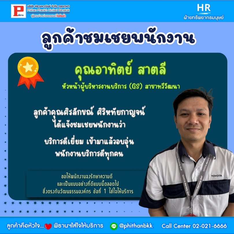 หน้าแรก>> แผนกทรัพยากรมนุษย์>> รางวัลและการชมเชย>> ชมเชยบริการ GS/BP 2568>> คุณอาทิตย์ สาตลี