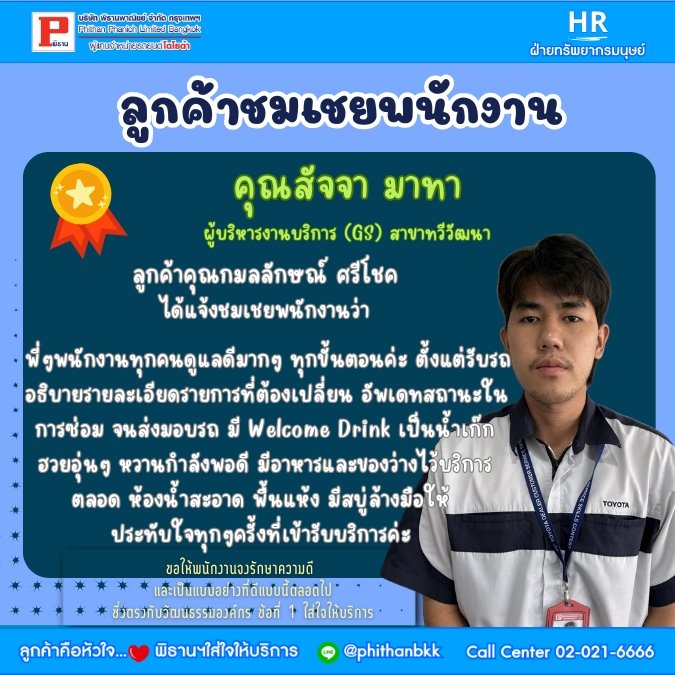 หน้าแรก>> แผนกทรัพยากรมนุษย์>> รางวัลและการชมเชย>> ชมเชยบริการ GS/BP 2568>> คุณสัจจา มาทา