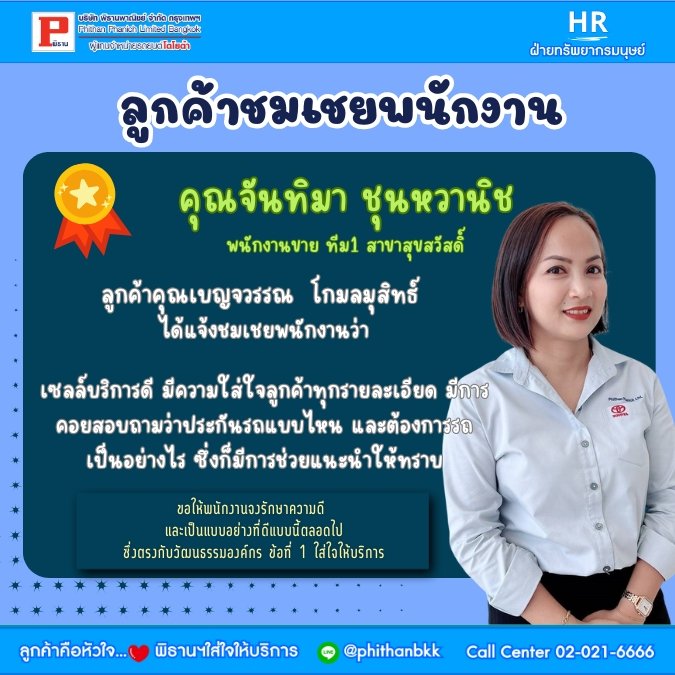 หน้าแรก>> แผนกทรัพยากรมนุษย์>> รางวัลและการชมเชย>> ชมเชยขาย 2568>> คุณจันทิมา ชุนหวานิช